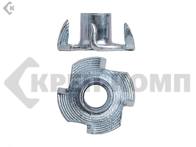 Крыльчатые гайки предназначены для работы с деревом. Они состоят из резьбовой муфты и крупной прижимной шайбы. Последняя покрыта заостренными выступами, фиксирующими крепеж в теле детали.
